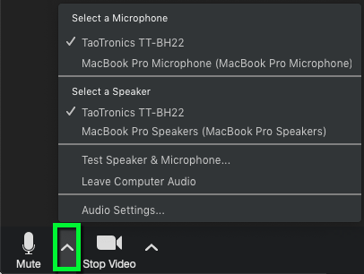 • Click the arrow next to the microphone icon to switch audio sources, test your computer audio, or change audio settings (e.g., photo at right). Use Zoom's testing Audio and Video tutorials for more help.