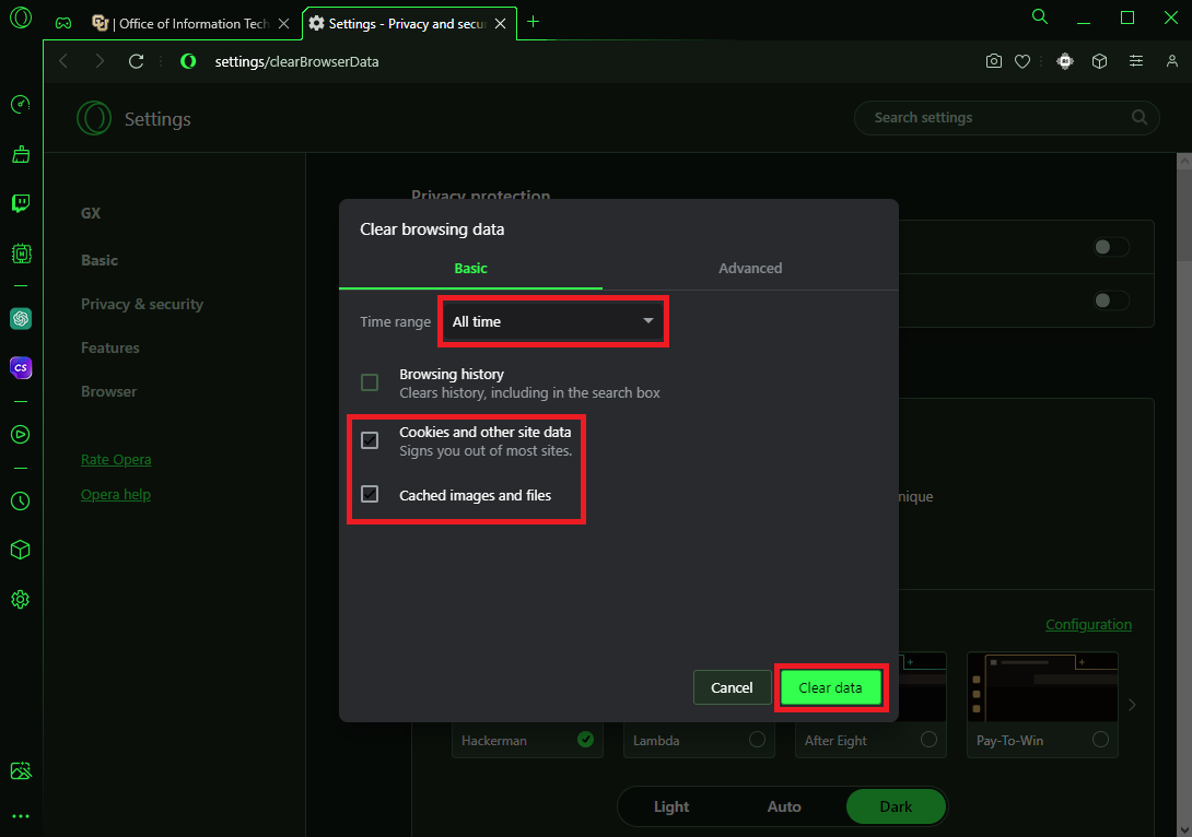 Web Browsers - Clear the Cache Step 1 Click the History icon on the sidebar Step 2 Click Clear Browsing Data Step 3 Select All Time from the time range dropdown. Make sure Cookies and other site data and Cached images and files are selected. When your selections are made, click Clear data