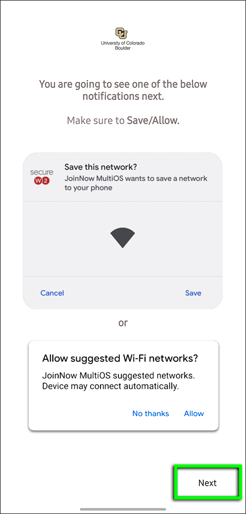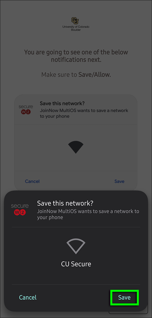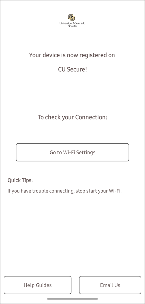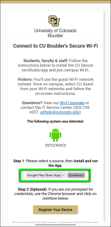 Using Google Chrome (preferred), go to wifi.colorado.edu, then click the Install the CU Secure Certificate button.