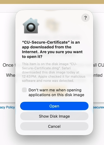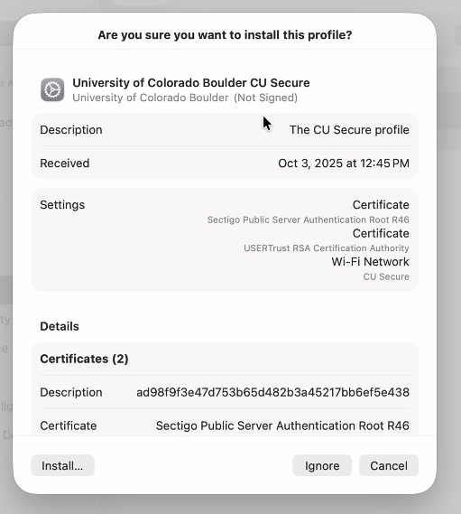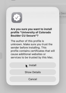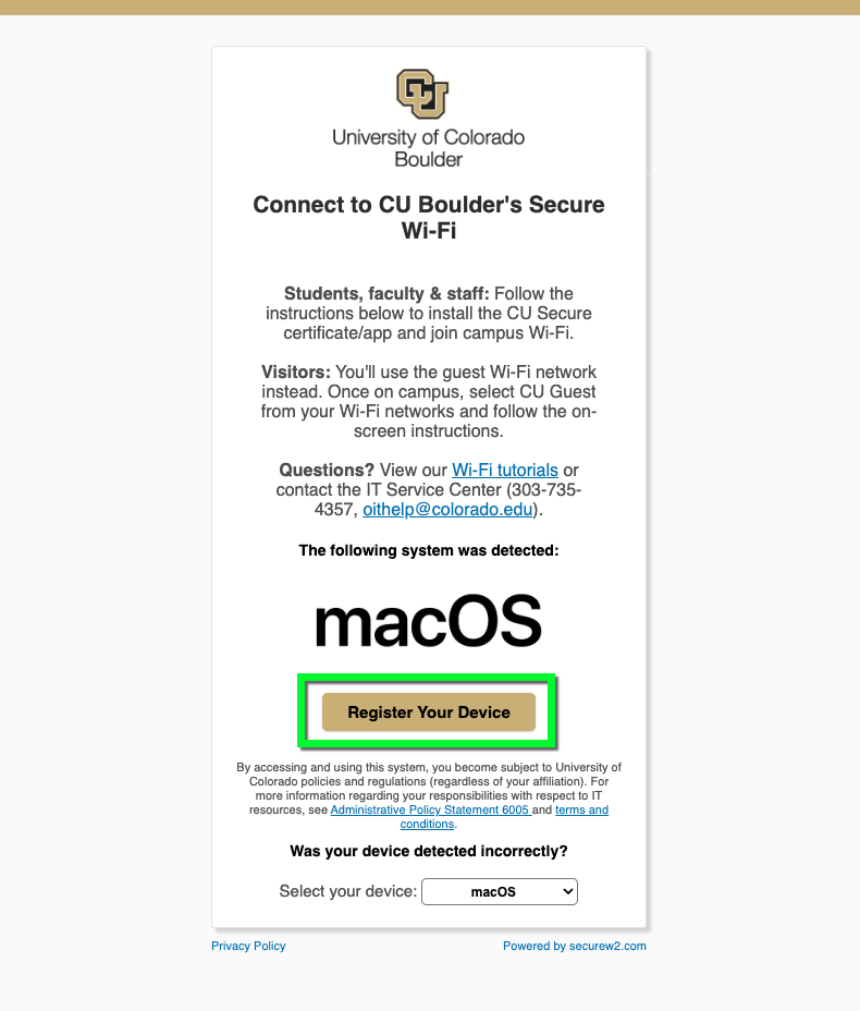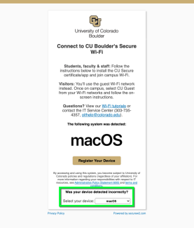 Using Safari,* go to wifi.colorado.edu, then click the Install the CU Secure Certificate button.