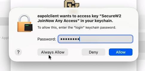 If asked to allow access to the "SecureW2 JoinNow Any Access" key in your keychain: