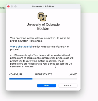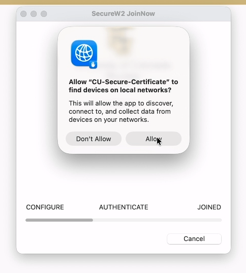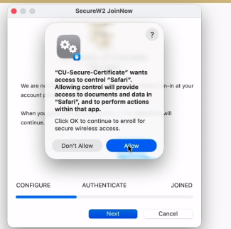 If asked to allow SecureW2 JoinNow to access confidential information stored in "CU Secure" in your keychain: