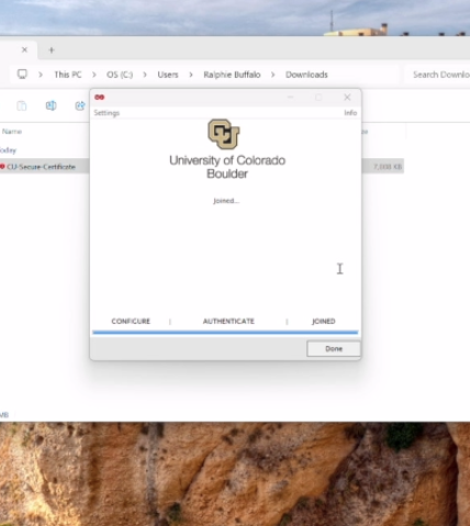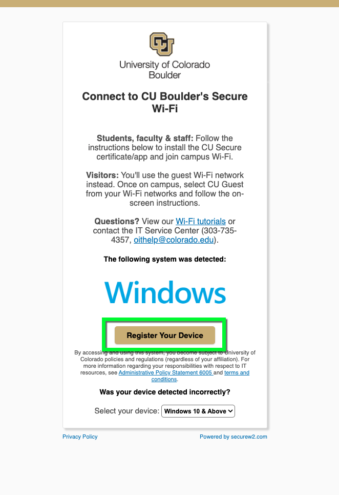 Go to wifi.colorado.edu, then click the Install the CU Secure Certificate button.