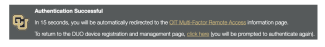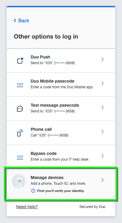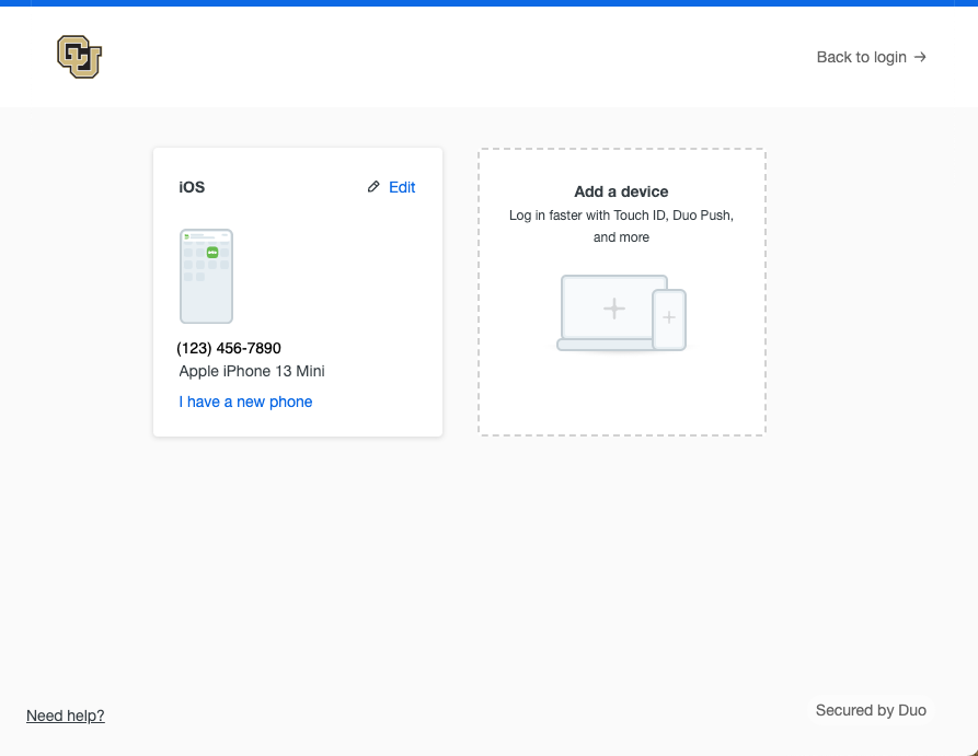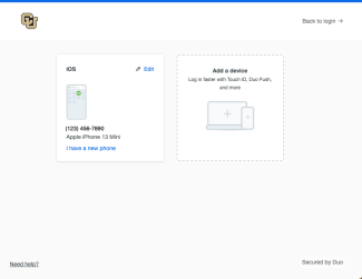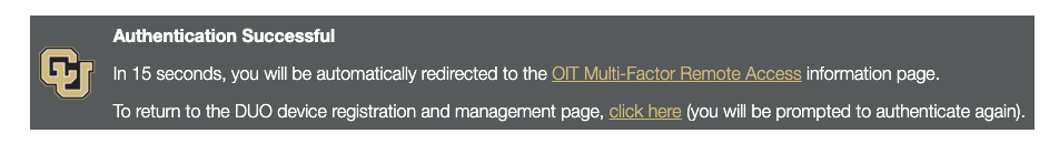 If you have already enrolled in Duo, you will be prompted to authenticate and taken to a screen similar to the one pictured. Select return to the Duo device registration and management page to verify your information is correct (skip to the end of this tutorial to see a screenshot of management options).