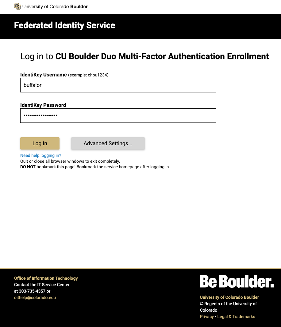 Go to the Duo multi-factor authentication enrollment website (https://duo.colorado.edu/) and sign in with your IdentiKey username and password.